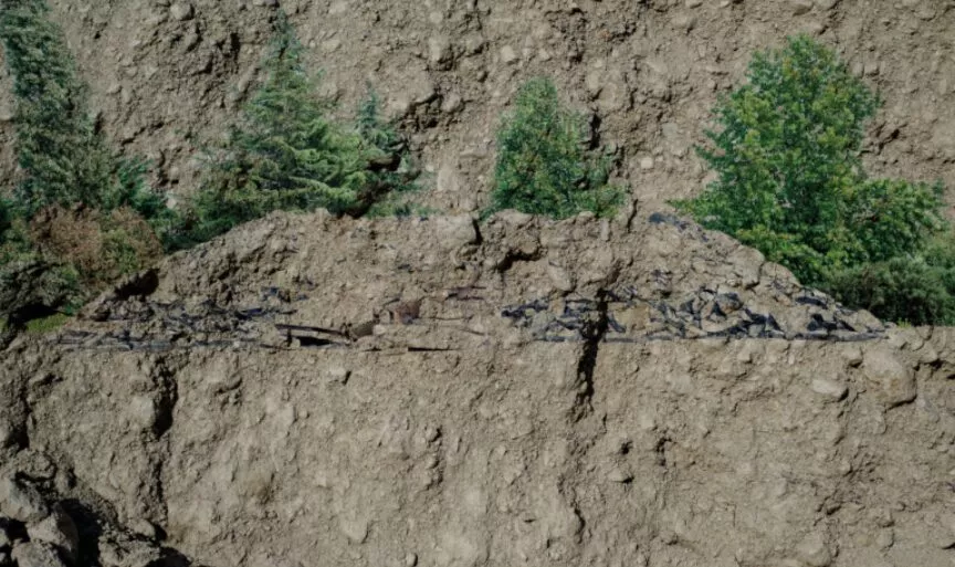 Au-delà d’une approche documentaire, Mouna Saboni se tourne vers la poésie et dévoile un travail sur la disparition. Dans ses images, elle crée un espace onirique, avec des photographies couleurs, puis en noir et blanc, très peu contrastées, aux échelles parfois trompeuses et instables. Des photographies silencieuses, où le temps semble être suspendu : les tas de terre déplacés par les engins se transforment alors en mont Atlas.